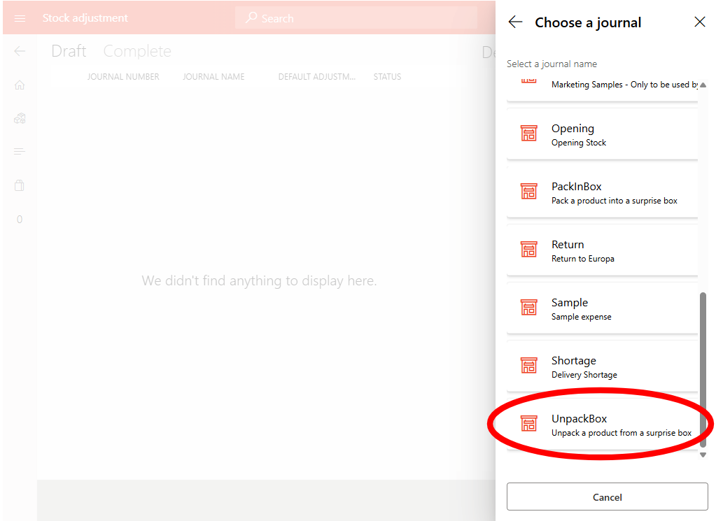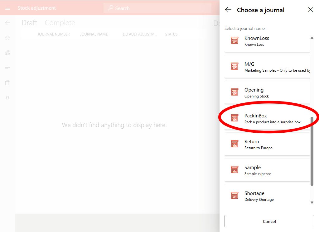 From the journal list, select PackinBox – used for items being packed into surprise bags.